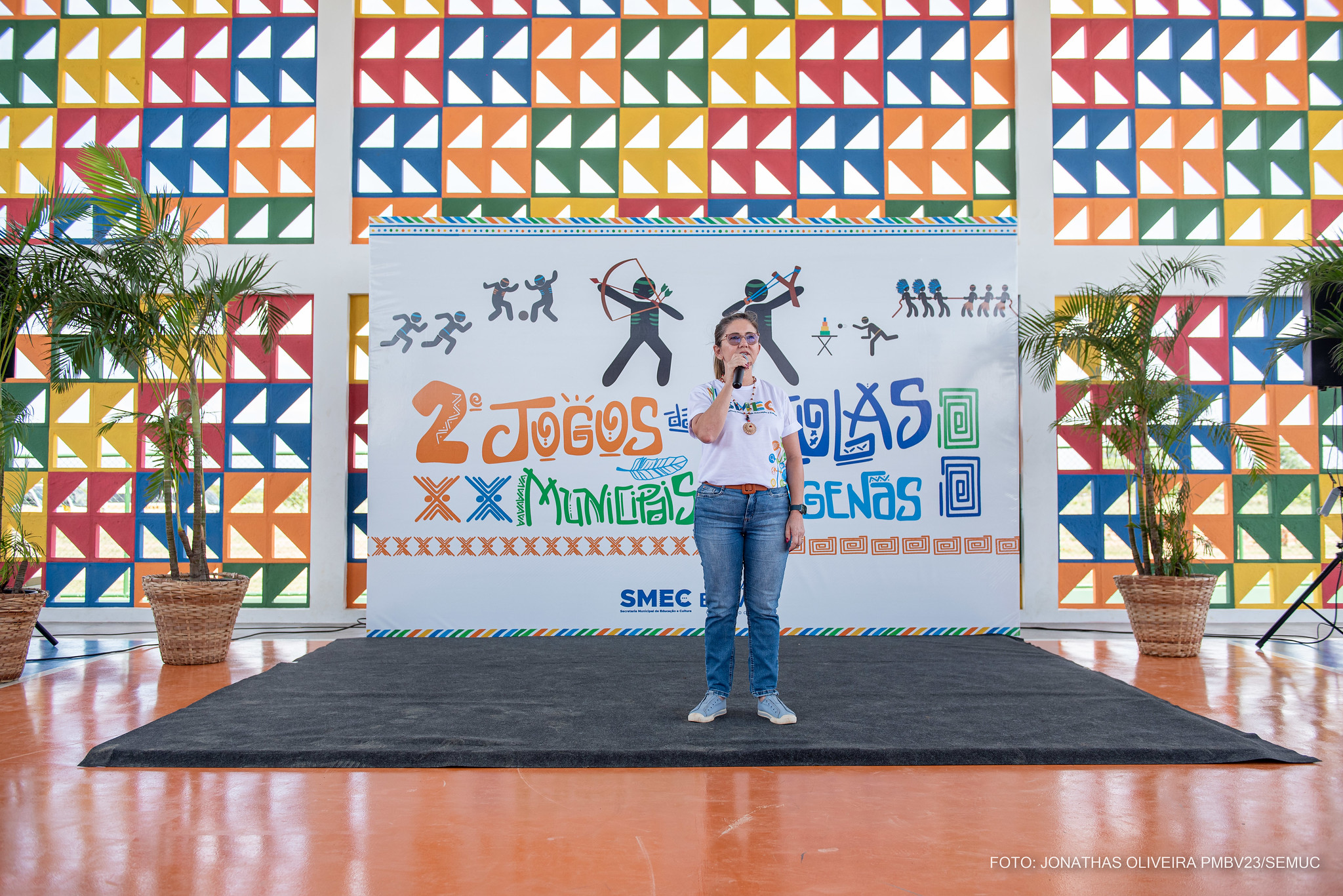 VALORIZAÇÃO – A secretária de Educação e Cultura, Consuêlo Sales, destacou que os jogos contribuem para a integração das comunidades e fortalecimento das tradições. “Mais que uma competição, o evento representa alegria, integração e valorização pela cultura indígena. Esta escola [Francisca Gomes da Silva] passou recentemente por revitalização total e recebeu uma quadra novinha, que já foi usada para as disputas. Novas entregas estão previstas ainda para este ano”, disse.