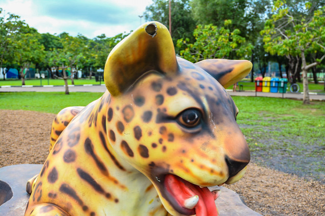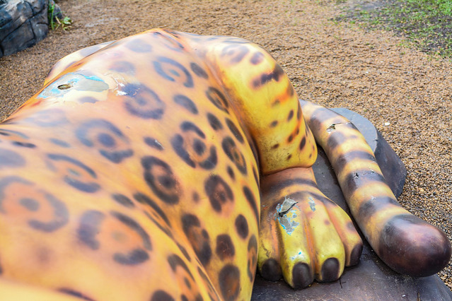 A estátua da onça pintada gigante sofreu danos em uma das patas e um dos refletores que iluminam o local também foi quebrado.