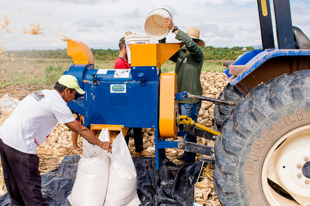A colheita é feita com o debulhador, um implemento utilizado para “separar" o grão da palha e do sabugo depois de colhido manualmente