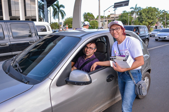 Além de distribuírem panfletos com informações sobre as formas de contágio e prevenção, os profissionais do departamento de IST/AIDS e Hepatites Virais conversaram com motoristas no sinal e pedestres sobre a importância do teste rápido para o tratamento precoce.