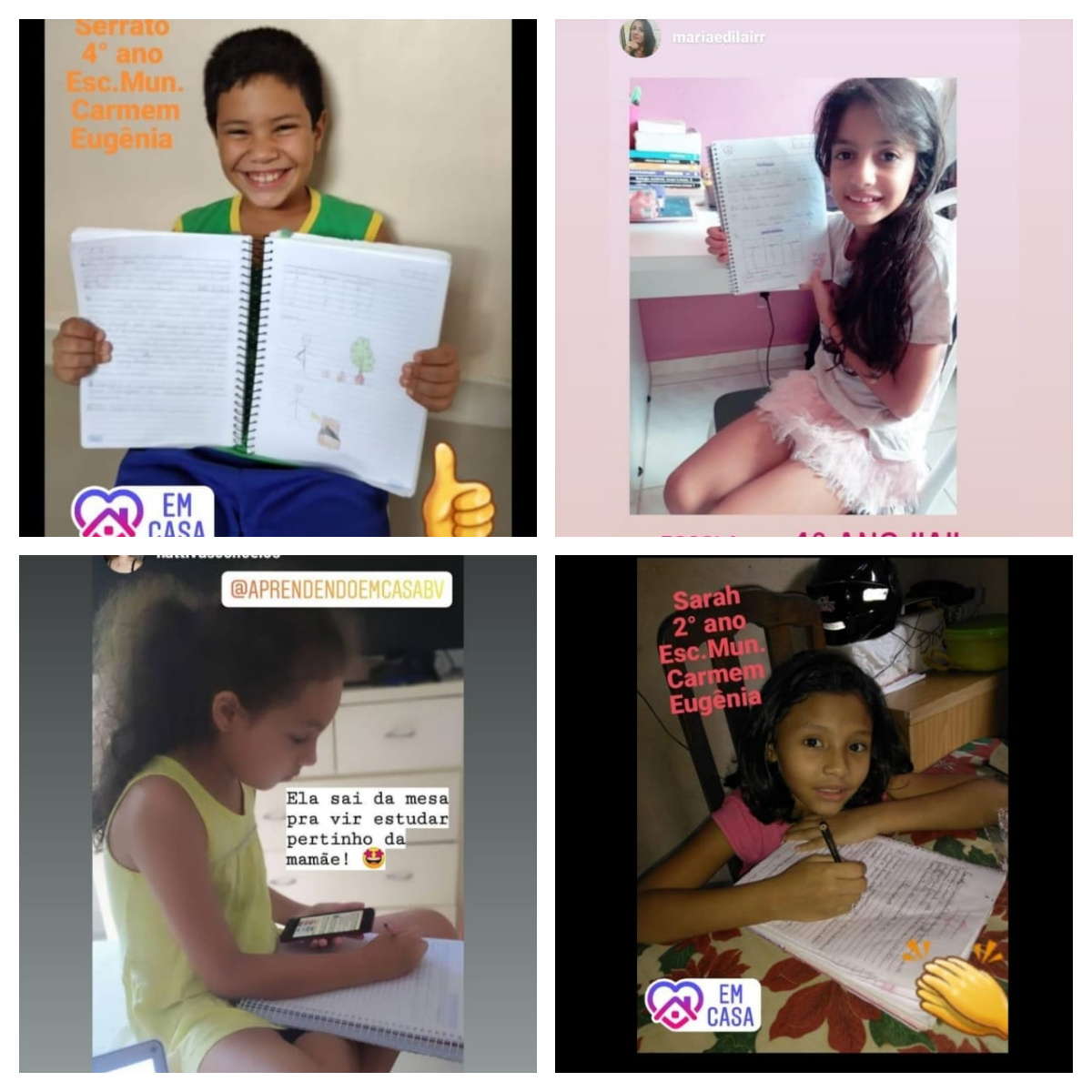 “ Essa experiência que estou tendo com elas em casa, está sendo muito boa, a gente acaba criando um laço afetivo maior ainda. Sempre procuro fazer as atividades mostrando empolgação, já que são lúdicas, se tornam bem mais fáceis. Eu conto histórias, eu danço, eu pulo, eu brinco. Essas atividades de certa forma estimulam a criatividade, melhoram o raciocínio das crianças e acabam despertando a imaginação delas” , declarou a mãe.