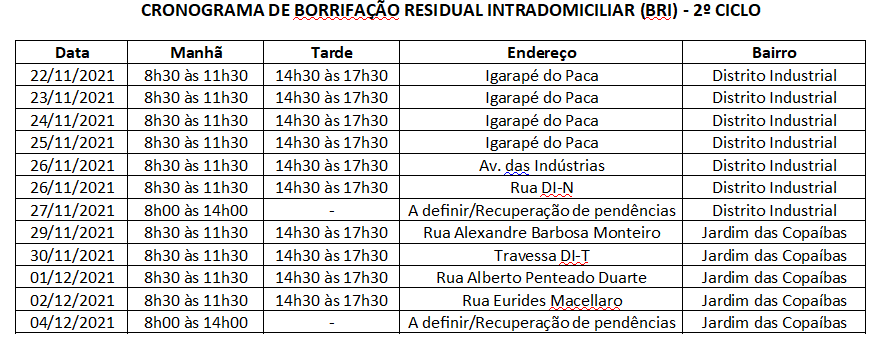 A ação tem a finalidade de cumprir o segundo ciclo de borrifação, nas ruas próximas a igarapés e outras localidades. A programação acontece durante a semana, sempre no horário das 8h30 às 11h30 e das 14h30 às 17h30 e nos sábados, quando necessário das 8h às 14h, para retornar em alguma residência que ficou com pendência ou estava fechada.