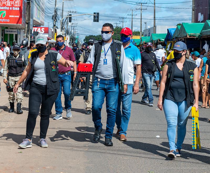 Nesse domingo, 23, a Prefeitura de Boa Vista promoveu uma ação de orientação e fiscalização na Feira do Garimpeiro, a fim de organizar melhor o espaço comercial para a passagem das pessoas sem aglomeração e evitar que os ambulantes tomem a pista de rolamento das calçadas ao longo da avenida Ataíde Teive. As feiras livres passaram por uma estruturação desde a retomada gradual em setembro de 2020, por meio do Decreto 97/E.
