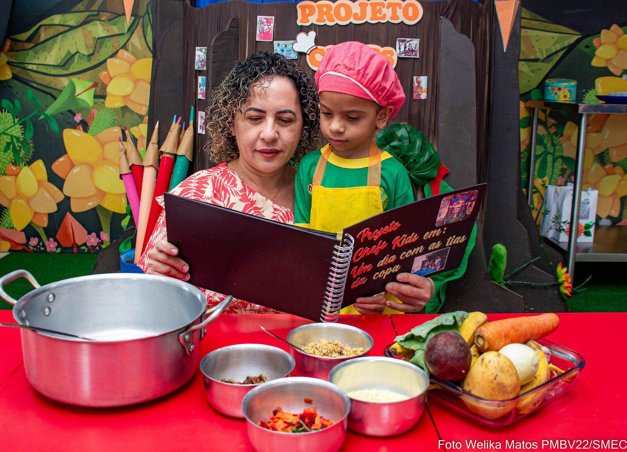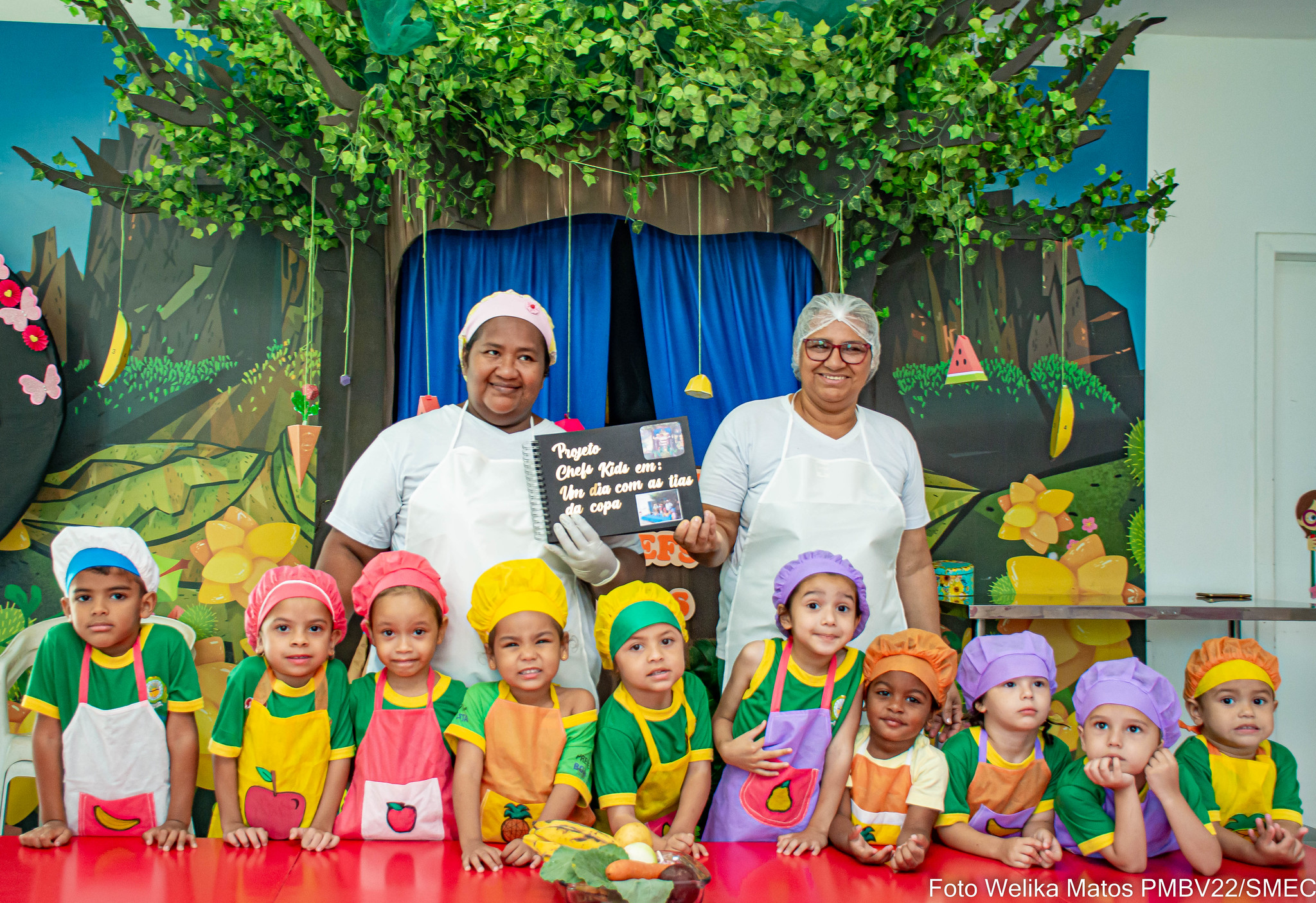 Crianças que integram as turmas Tia Lourdes e Sinhá Laranjeira do Núcleo de Creches do Cidade Satélite II participaram, nesta semana, do projeto “Chefs Kids: Um dia com as tias da copa”, que tem como objetivo estimular o consumo de alimentos saudáveis, assim como promover a integração entre os próprios alunos, professores e família.