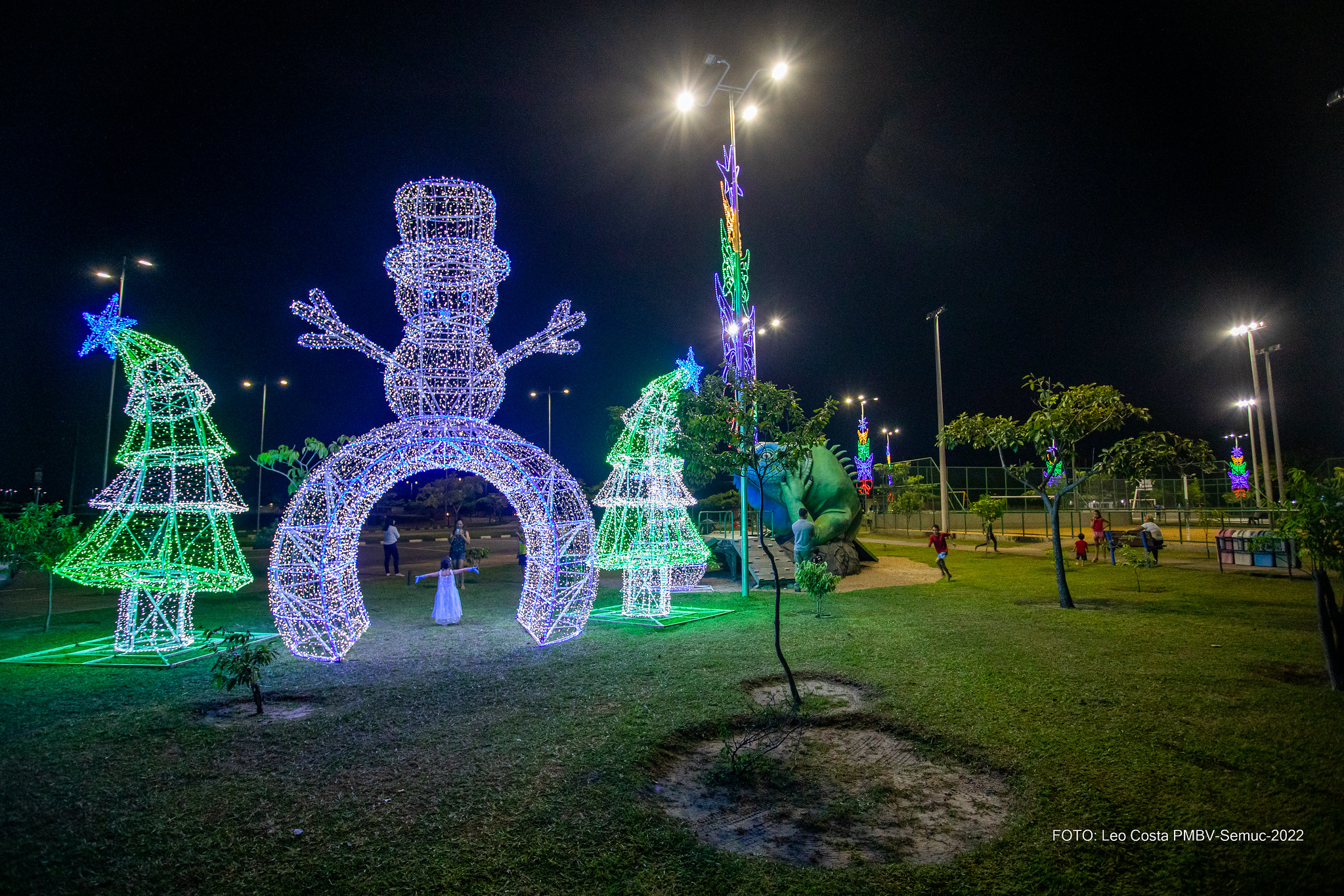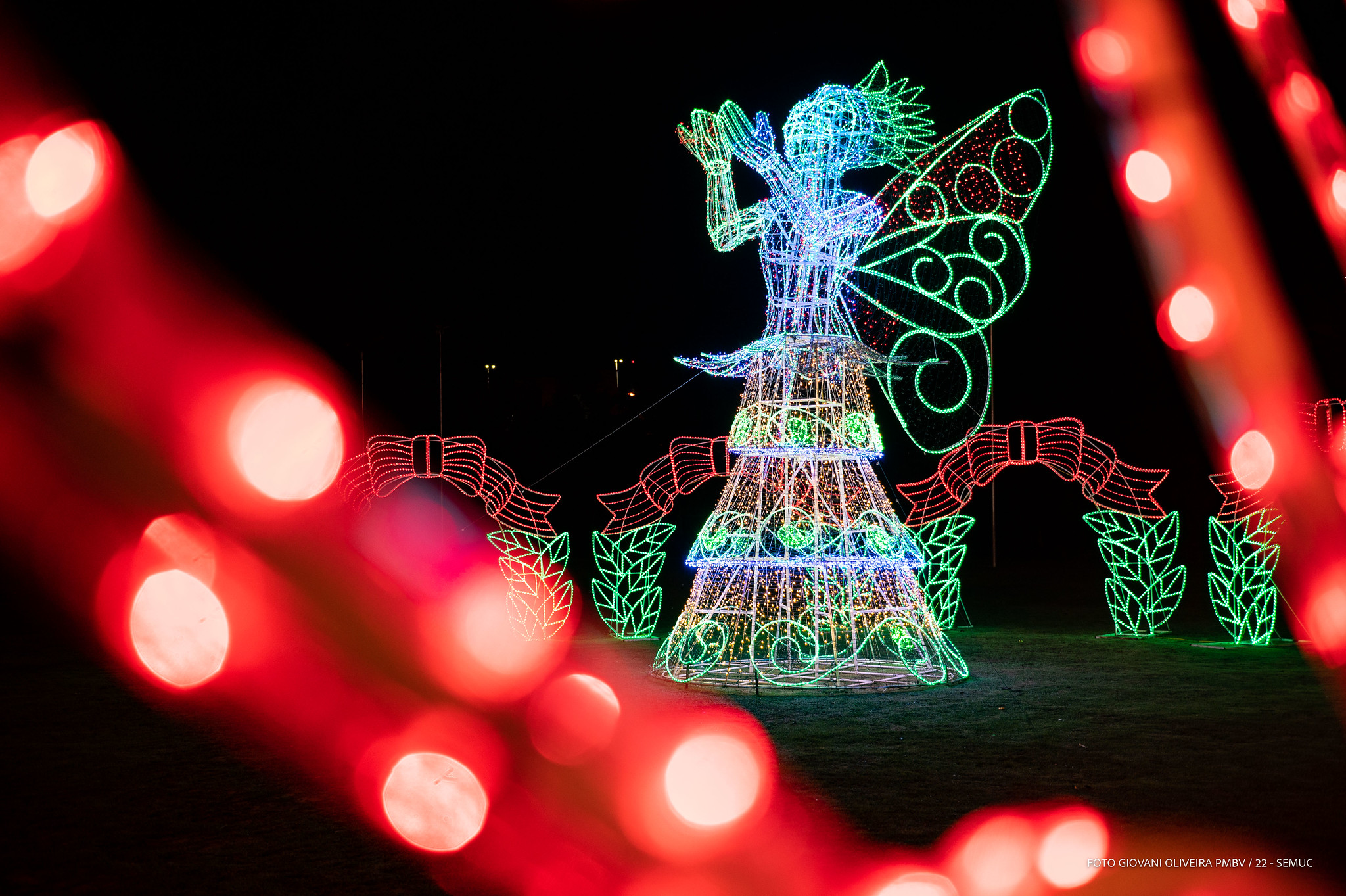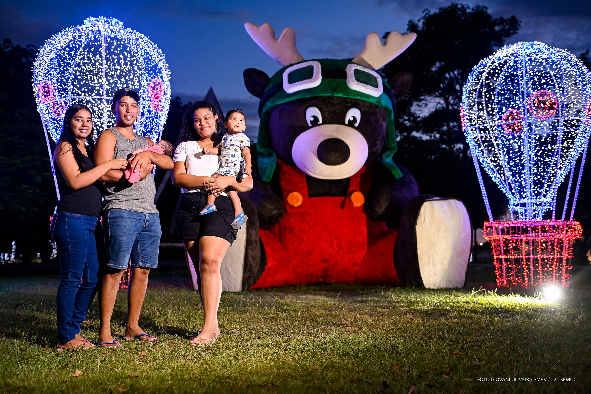 Tem urso gigante, túnel de luzes, balsa com trenó do Papai Noel às margens do Rio Branco, além de símbolos do Parque que ficaram ainda mais belos, como o Espelho D’água, que está todo iluminado em verde, com detalhes de árvores de natal e borboletas.