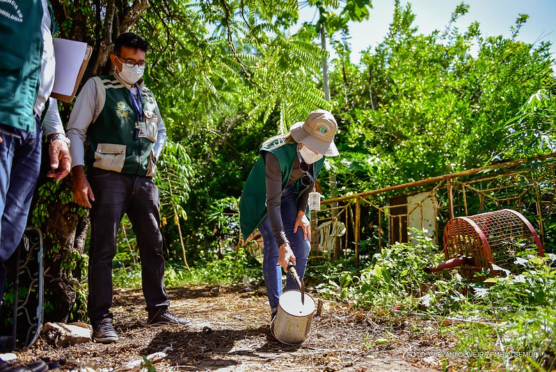 Durante as visitas os agentes fazem uma inspeção no quintal da casa para verificar se há algum recipiente que possa acumular água e se tornar um criadouro do mosquito.