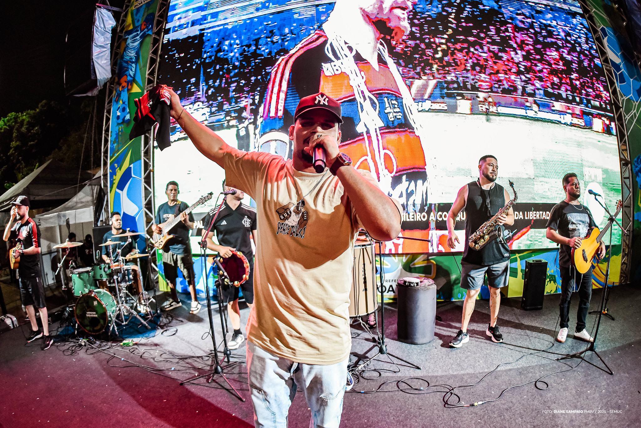 Após o apito final, a celebração ganhou ainda mais ritmo com shows de pagode. Na Praça Fábio Marques Paracat, quem comandou a festa foi o grupo A Vibe é Nossa. Já no Parque do Rio Branco, o Nesse Eskema levantou a multidão ao abrir o show com o Hino do Flamengo, criando um coro emocionante dos rubro-negros.